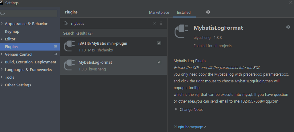 내가 사용 중인 플러그인은 MybatisLogFormat으로 마켓플레이스에서 검색해보면 비슷한 기능의 플러그인이 있다.