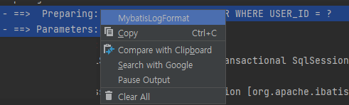 사용방법은 preparing, parameters 부분을 모두 블록 처리하고 오른쪽 버튼 클릭 > mybatisLogFormat 클릭하면 파라미터가 포함된 쿼리를 복사할 수 있는 툴팁이 뜬다. 툴팁에서 copy를 클릭하면 클립보드에 복사된다.